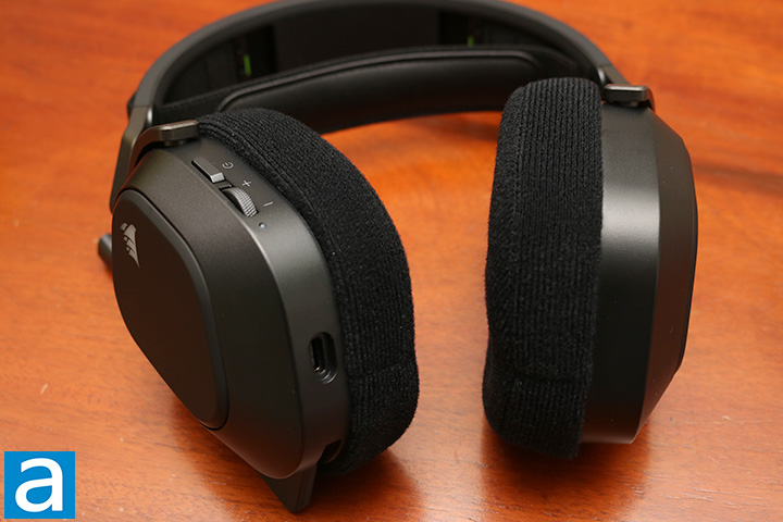 The Corsair HS80 RGB Wireless definitely has a quality feel to it with the materials it is made out of. Most of it is plastic, but it does not have the creak and crack of cheap plastic to it. This is because the connection between the headband and the ear cups is metal. Furthermore, the headband also has a soft rubber-like feel, which adds to the perceived build quality. Unfortunately, the earcups are a bit of a fingerprint magnet, but with this on your head, you will not see it much.