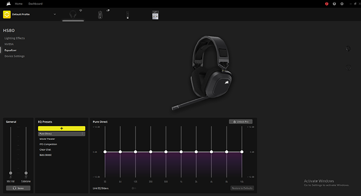 After selecting the Corsair HS80 RGB Wireless on the main page, you are brought to an area where you can customize the onboard RGB LEDs, which, in this case, is the Corsair logo on the earcups. You can find your standard lighting effects to customize the logo and adjust the colors. Also in the software is the ability to adjust the equalizer. There are a few presets, and I recommend the Pure Direct one. It is the most balanced, but you can customize it to fit your needs. There are other options as well, which either boost the bass, treble, or midrange. There are device settings you can adjust, like having the battery bar in your icon tray, boosting the microphone, or adjusting how long it takes for the headphones turn off due to inactivity. The software is extensive, easy to use, and provides enough customization to make it worthwhile.