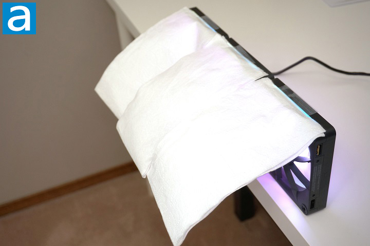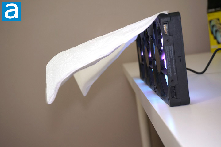 To evaluate the performance of the Corsair iCUE Link LX120 RGB fans, we used the APH Networks proprietary testing method, developed in-house. This ingenious approach offers an affordable way to assess fan performance using just tissue paper and tape. The test results provide a qualitative measure of airflow, airflow consistency, and the static pressure generated by the fan. The experimental setup was simple. As depicted in the above photos, a piece of tissue paper was placed on top of each fan, naturally falling onto the outlet side where the motor assembly is positioned. The fans were placed near the edge of a table to minimize the effect of reflected airflow on the results. After powering on the fans, we assessed airflow, consistency, and static pressure by observing the tissue paper's behavior. Tests were conducted at all available RPM levels, but for this review, only the photos of the fans at maximum RPM are shown, representing their best possible performance in terms of airflow and pressure.