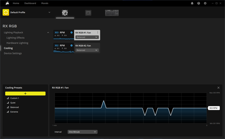 The module for the fans consists of three main pages. The first tab, Lighting Playback, allows you to customize the lighting effects on the fans. Here, you have access to a wide range of lighting effects and colors, including multiple static and dynamic modes. Additionally, you can assign colors to indicate different system statuses, such as temperatures. The Lighting Effects tab is used to set lights while iCUE is active, while the Hardware Lighting tab is used for saving effects to the hub itself for use when iCUE is not running. Under the Cooling tab, you can choose from different cooling presets and fan curves. There are default presets like Quiet, Balanced, and Extreme, but you also have the option to create your own presets and fan curves according to your preferences. Each channel can be set to its own preset. The Device Settings section offers additional fan-specific settings that can be adjusted.