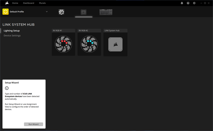 The module for the Link System Hub is straightforward and displays all connected fans or devices. It allows you to identify each fan, making it easier to set up the lighting correctly. Additionally, you can use this module to update firmware. Overall, the iCUE app offers a polished and user-friendly interface, although it is a bit resource-intensive when running.