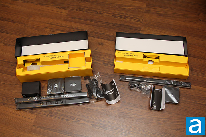 Inside each shipping box was one pack of the Corsair iCUE LT100, which can be purchased as a Starter Kit and Expansion Kit. I am pretty sure both can fit into one much smaller shipping box, but hey -- America! The retail packaging of the Corsair iCUE LT100 is immediately recognizable to anyone who are familiar with products from the company. The telescoping boxes feature a predominantly black color scheme on the lids, complemented by yellow trays inside. Everything is contrasted by white or yellow text on the darker shades and black text on the lighter shades. Photos of the lighting towers in three-quarters view occupy the majority of the real estate in front. At the top left corners, you will find Corsair's logo. The name and description of the product is printed at the bottom, which is "iCUE LT100" and "Smart Lighting Tower". The text inside a yellow box distinguishes between the Starter Kit and Expansion Kit. Further feature highlights and miscellaneous product information such as specifications and system requirements can be found on the remaining sides of the box.