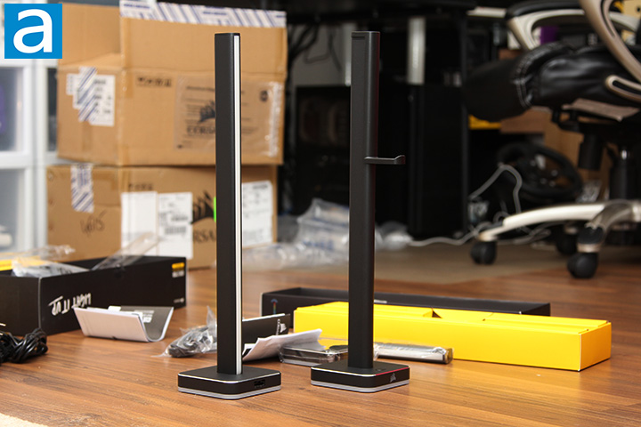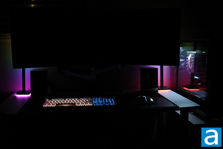 Each tower has 46 RGB LEDs for 27 independent illumination zones. The LEDs located at the bottom perimeter of the base and on the posts. A diffuser is present in all locations for a soft light output. Meanwhile, an included accessory can be clipped to the top of any one of the towers to hold your headset. The plastic headset holder accessory has 3M double-sided tape on the inside if you want to permanently affix it on, but I think the LT100 looks better without it. Also, it would have been nice if it was also made out of aluminum.