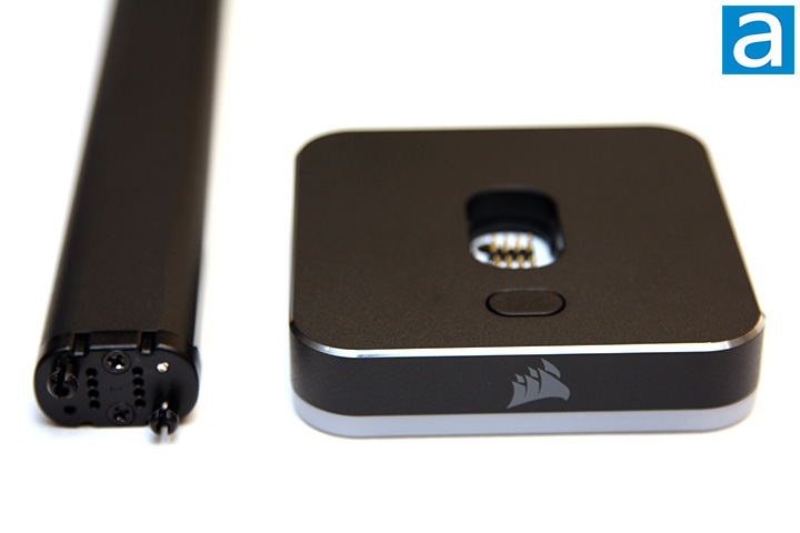 The above photo gives a closer look at the base and connector of the Corsair iCUE LT100. The master base is shown, with the difference being the master has a button on top while the slave does not. The button can be used to turn the LT100 on or off, but it only works when iCUE is not running, such as when your PC is off or locked. I found this kind of strange, and I would prefer the button to work at all times regardless of whether the system software is active or not.