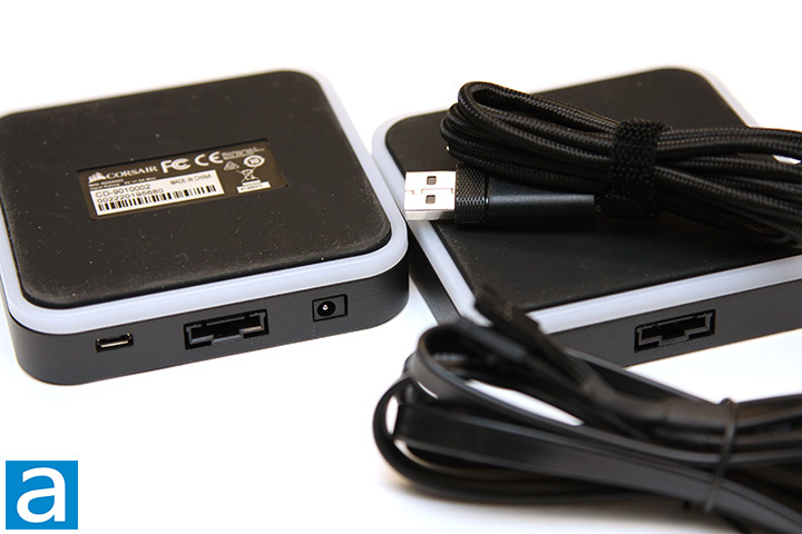 Here is a shot at the bottom of both Corsair iCUE LT100 bases. The master unit, on the left, has a USB Micro B port and DC 5V input in addition to the proprietary connector, while the slave unit only has the proprietary connector as aforementioned. would have much preferred a USB Type-C port instead, given it is 2020. The proprietary cables, whether it is the standard one or the Y-split, are all flat, rubber coated, and 1.5m long, which I find reasonable for a standard desk configuration. A little longer would not hurt though. The power adapter cable is 1.8m long and is neither flat nor braided. The USB cable is braided and 1.5m long with a standard non-gold plated connector. When we bring about the question of whether gold plated connectors are actually useful or not, let us just say if it was the actual pins, then possibly, since gold offers better conductivity than other metals. This theoretically establishes a better connection with your computer, but on a digital signal level, we must understand it is a discrete one or zero; if anyone tells you they can tell the difference, you can defeat their theory with a double blinded test. Additionally, if you are referring to the gold part of the connector you see on the plug, I would like to point out it actually does not make any physical contact electrically with your computer. In other words, it is nice to have, and it is pretty to look at, but it is not anything significant on a practical level. The lack of a gold-plated USB connector will not have any impact on the Corsair iCUE LT100 lighting towers.