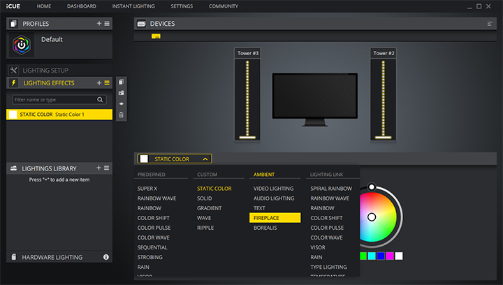 The Profiles section allows you to select between profiles, as its name suggests. The Lighting Setup screen is where you can detect connected LT100 towers and configure it so the software knows what the physical placement is on your desk. The Lighting Effects tab is where you can play around with the... well, lighting effects of the Corsair iCUE LT100's 27 independent illumination zones. There are 26 on each post and 1 on each base. Corsair's iCUE is designed to configure the colors by layer, where each layer can only be in one color or effect at a time. To get them to display different colors, you will have to create multiple layers. Lighting effects options are shown in our screenshot above. Lightings Library are user pre-configured effects and Hardware Lighting allows you to set what the LT100 will do when iCUE is not running, such as when your PC is locked or off.