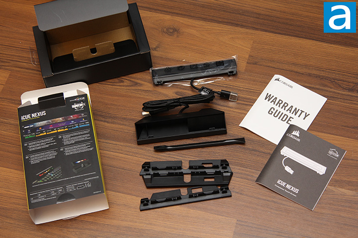 Once you slide out the inside box from the wrapper, you will find all the contents neatly placed inside a tray. Out of the box, you will receive the Corsair iCUE Nexus screen itself, standalone base, three keyboard mounting brackets for various Corsair models, bracket removal tool, user manual, and warranty guide. The bracket removal tool is a nylon pry bar similar to those commonly used for removing trim panels in your car without scratching anything. All in all, the bundle has everything you need and nothing you do not.
