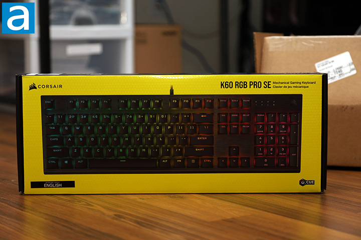The retail packaging of the Corsair K60 RGB PRO SE is immediately recognizable to anyone who has seen peripherals from the company at the local computer shop in the last little while, assuming they are still open where you live and you still go to computer shops. It uses the same template as the Corsair K57 RGB Wireless and K70 RGB MK.2 Low Profile. The predominantly yellow color scheme is complemented by black strips on the side, contrasted by the white text on the darker shades and black text on the lighter shades. A photo shot from the top of the keyboard occupies majority of the real estate in front. At the top, you will find Corsair's logo. The name and description of the keyboard is printed next to it. At the bottom is a sticker to indicate its English keyboard layout. On the right is a Corsair iCUE logo. Further feature highlights and miscellaneous product information such as specifications and system requirements can be found on the remaining sides of the box.