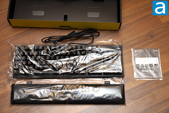 Out of the box, you will receive everything you need with no extras. Securely placed inside the box is the Corsair K60 RGB PRO SE keyboard itself contained in a clear plastic bag, while its detachable wrist rest is wrapped inside a separate plastic bag. On the product literature side, you will find a warranty guide and quick start guide.
