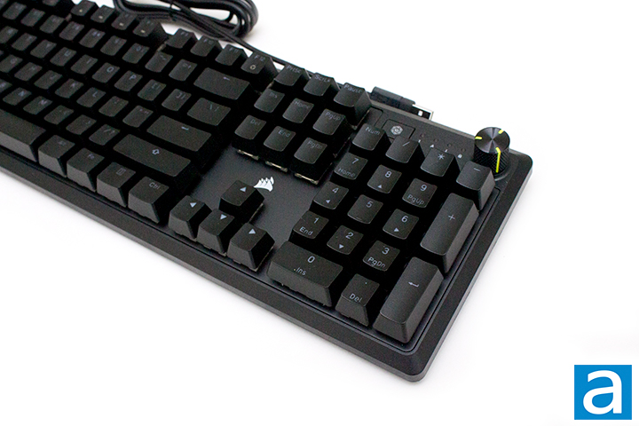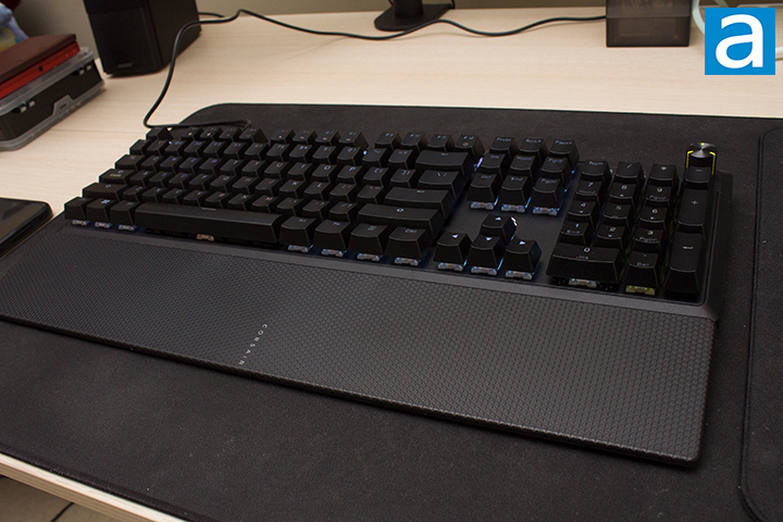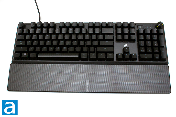 The Corsair K70 Core is the latest rendition of the K70 series, which we have extensively covered with the K70 RGB MK.2 Low Profile, K70 RGB Pro, and K70 RGB TKL Champion Series. The appearance of the Corsair K70 Core is simple and clean with a standard appearance. The basic look might not be very impressive, but it offers a similar appearance to the rest of the lineup. One primary difference, however, is the lack of a large forehead, which was a common feature on other Corsair keyboards like the K70 RGB Pro. This K70 Core features a floating key or low bezel design, exposing the switches underneath the keys. Underneath the backplate, we find a plastic casing. Corsair opted to place their sails logo above the arrow keys, which leaves the top right corner free for a very handy knob. The knob is very smooth to use, and I had no issue with the functionality at all. The K70 Core does come with a wrist rest, which I appreciate given the flatter typing angle. The wrist rest is purely plastic with no cushioning. I personally prefer this, as I find wrist rests with cushioning tend to get worn out a lot faster.