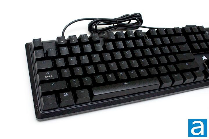 The Corsair K70 Core comes in the standard full size QWERTY ANSI layout. The full size or 100% layout typically has 104 keys. The QWERTY ANSI layout is the standard American layout, which uses a single row Enter key, as seen in some of the previous images. The keyboard uses a standard bottom row. For those who do not know, 1U stands for a single unit, meaning a 1.25U keycap is 1.25 times wider than a regular one. As such, the keys in this row are 1.25U, excluding the space bar. The space bar uses the standard 6.25U. For the average user, getting used to the K70 Core will feel quite normal.