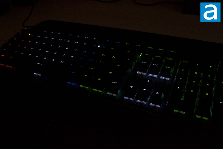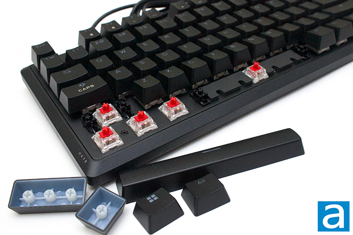 As for the keycaps, these are made out of ABS plastic. I personally prefer PBT, or polybutylene terephthalate, because the material is harder and resists keycap shining better. The lettering is printed on with a laser etching process, which removes the cover to reveal the translucent plastic used for shine through. The font used is quite normal, which is something I personally prefer. The font style is consistent through the whole keyboard, which is good. Underneath the keycaps, you can see the typical MX stem. This means you can replace the keycaps with another set. You will need to be careful when purchasing Cherry profile keycaps, as this keyboard utilizes north facing lights, and will possibly have interference. In regard to thickness, they are about 1mm thick. This is on the thinner side, but manufacturers do tend to use thinner keycaps. The significance of the thickness of a keycap is important for the feel and pitch. To keep things simple, thicker keycaps have more depth and produce a deeper thock, while thinner keycaps produce a higher pitch sound.