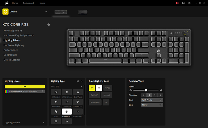 The Key Assignment tab is where you can control the function of each specific key. This includes remapping keys to keystrokes, mouse functions, media keys, macros, launch apps, switch profiles, or voicemod. Hardware Key Assignment is very similar, but can be accessed when iCUE is off, but with limited functionality. The Lighting Effect tab is where you can adjust your keyboard lighting effect for each individual key on the Corsair K70 Core. Each individual key can be independently controlled, making for some possible unique combinations. There are standard preset effects such as Watercolor, Color Pulse, Color Shift, Color Wave, Audio Visualizer, Rain, Rainbow Wave, Spiral Rainbow, Type Lighting, and Visor. Each of these options can go into further customization. Hardware Lighting is Similar to Lighting Effects, but once again, they can only be used when iCUE is off with reduced options. Performance is where you can choose to disable keys or key combinations such as the Windows Key, Alt + Tab, Alt + F4, and Shift + Tab. Control Dial allows the user to manipulate the knob controls to act as Volume, Brightness, Scrolling, or Zoom controls. Finally, we have Device Settings, which allows the user to update the firmware, adjust polling rate, adjust backlight brightness, adjust keyboard layout to other languages, adjust debounce time, toggle tutorial tooltips, and toggle PlayStation Mode. You can also save profiles onto the onboard memory or clear it.