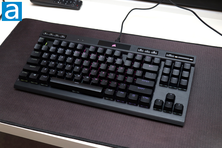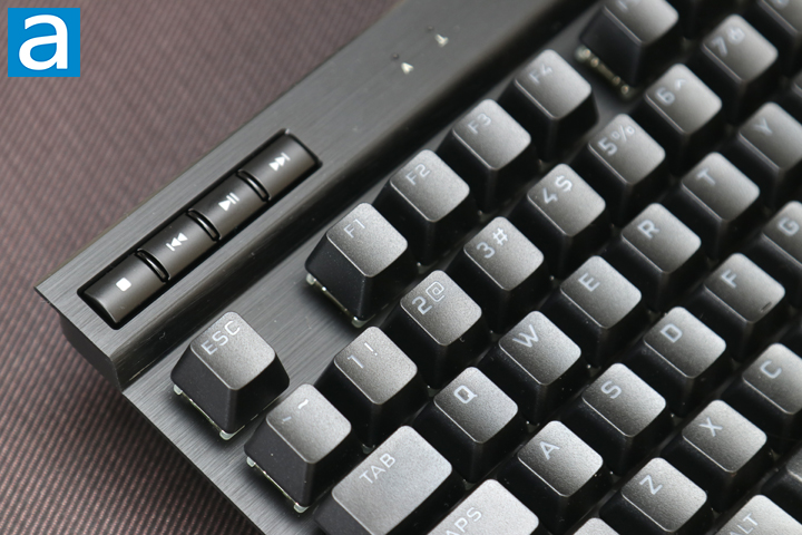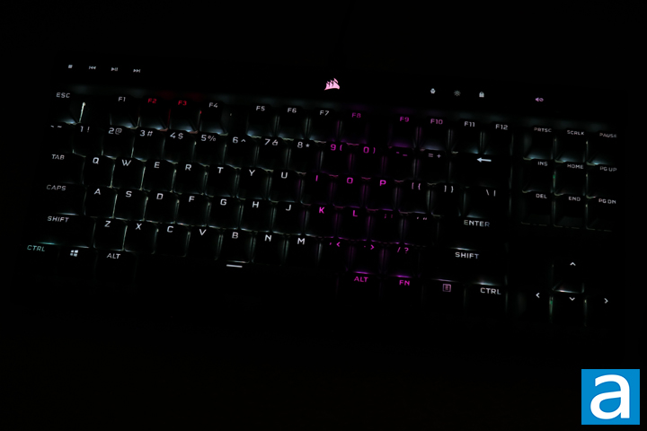 As you can tell by the name, this is an 87-key keyboard with the QWERTY ANSI layout. The whole keyboard is also pretty standard in its spacing, with a standard size of keys on the bottom row. This means the Windows, Fn, Ctrl, Alt, and Menu keys are all the same size. I am quite happy to see this, especially since older Corsair keyboards often utilized slightly different spacing between keys here, which made it a bit more difficult to install custom keycaps. Otherwise, the indicator LEDs are located on the top left side, beside the media keys, and they glow white when they are active.