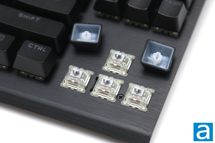 Our unit of the Corsair K70 RGB TKL Champion Series features Cherry MX Speed switches. This features a linear travel and relatively light pressure required to push the switch. According to Cherry and Corsair, these key switches are guaranteed to last 100 million actuations. While these are linear like Cherry MX Red, Speed switches have an initial actuation distance of 1.2mm and an overall travel distance of 3.4mm. This has an actuation force of 45g, which is similar to MX Reds. These are also the same switches we received with our Corsair K95 RGB Platinum XT, but you can purchase the K70 RGB TKL Champion Series with Red switches. Otherwise, the LED for each switch sits at the top of the switch, while the whole body is clear. We will see how this affects our lighting situation later in our review.