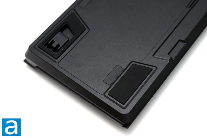 Flipping to the back side, a big label is here with some certification information and serial number to identify the Corsair K70 RGB TKL Champion Series. In each corner you can see there are large rubber pads to keep the keyboard in place. The back rectangles have cutouts where the extending feet can kick out to raise up the keyboard. These feet are also covered with rubber tips to keep the grip regardless if the keyboard is propped up or not. Internally, there is 8MB of memory to store your profiles as well as a 32-bit ARM Cortex processor. One other unconventional feature that we saw in another Corsair product, the Sabre RGB Pro is the AXON Hyper-Progressing Technology, which allows users to boost polling rate up to 8000Hz, as well as higher rates of 4000Hz and 2000Hz. Corsair recommends only using the full 8000Hz polling rate on a computer equipped with a recent Intel Core i7 or AMD Ryzen 7 CPU.