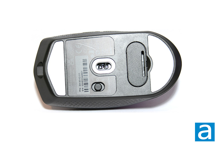 At the bottom of the mouse, the feet and sensor can be seen. The pads are made out of PTFE, commonly known as Teflon. This is fairly standard across mice in general, so you know what it is. The two Teflon pads allow the mouse to glide smoothly when being dragged across any flat surface. The Corsair Katar Elite Wireless uses a Corsair Marksman sensor, which is designed in conjunction with PixArt. This sensor can sense up to a whopping 26,000 DPI, 650 IPS tracking speed, an acceleration of 50g. This are impressive specifications and an upgrade compared to the Katar PRO XT, but we will see how this sensor actually performs in our subjective performance tests on the next page. A bit of spoilers here though -- the Corsair Marksman sensor is the exact same sensor used on the Corsair M65 RGB Ultra. When adjusting your sensitivity, you are able to adjust the DPI by intervals of 1, which is as precise as it gets. The Katar Elite Wireless runs at a maximum polling rate of 2000 Hz, which can be adjusted at four other settings of 125 Hz, 250 Hz, 500 Hz, and 1000 Hz.