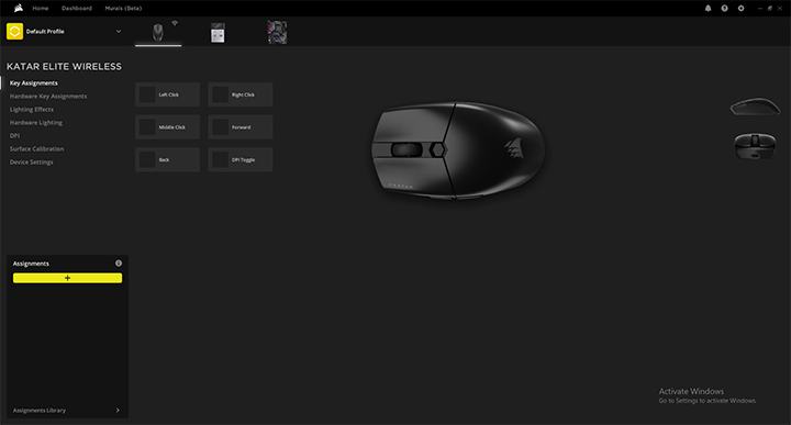 The Corsair Katar Elite Wireless is compatible with the company's iCUE software, which is a 1.1GB file that can be downloaded from Corsair's website. iCUE works with all Corsair products to adjust performance settings, customize features, and synchronize RGB LED lighting effects. As seen in the screenshot above, the left side displays a tab where various configuration tabs can be accessed to change the lighting and performance of the mouse. The main display in the center allows the user to implement those changes based on the tab that is currently selected.
