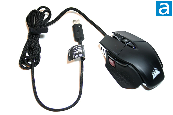 A braided cable is fed out from the center of the front end of the mouse, likewise to pretty much everything I have used in the past. Aside from looking nice, the braided cable also provides less friction than a regular rubber-coated cable, allowing for smoother mouse movement. The 1.8m length is industry-standard and does the job well if you like to keep your PC off your desk or somewhere at a reasonable distance. The mouse connects through a USB Type-A connector with the Corsair logo placed on the end. While adding gold plating would have looked nice, it would not affect performance. Not having a gold-plated connector makes sense in this case as it adds no benefit, but raises the cost. The cable is very flexible, making it easy to run through difficult areas when connecting it to a USB port.