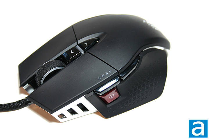 At first glance, the Corsair M65 RGB Ultra has a very ergonomic look to it. It looks like it is built for gaming, and the big red sniper button on the left side adds to this. The mouse has an asymmetrical shape, designed specifically for right-handed users. This is evident by the left side thumb rest. Both sides of the mouse have textured grips, making it relatively easy to hold. On a side note, the texture Corsair opted to use resembles the triangular pattern seen on the retail box. I enjoyed how this felt in my hand, as it made holding it very easy. The mouse shell is covered in a smooth black plastic with the Corsair logo located at the back and an M65 logo just barely visible on the top of the left primary button. The exterior also reveals an aluminum frame, which helps make the mouse feel more solid.