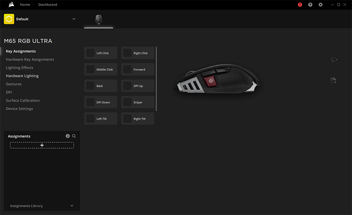 The Key Assignments tab allows users to change the function of the mouse buttons and even tilt directions. Only the left and right tilt angles can be edited here. Either way, the tilt direction mapping is incredibly unique as you can change media functions such as increasing or decreasing volume just by tilting the mouse. Further actions include macros, text, launch application, timer, disable, and profile switching. Users can save configurations they might find themselves coming back to in the Assignments Library, which is a sub-tab found directly under the Key Assignments tab. The Hardware Key Assignments tab serves the same function, except with the option of adjusting tilt directions. The Lighting Effects tab, as the name implies, allows users to adjust the RGB LED lighting on the mouse. In the case of the Corsair M65 RGB Ultra, you will only see the lighting change on the scroll wheel and the logo at the back of the mouse. There is a large selection of lighting effects to choose from under the three sub-tabs; those being predefined, custom, and lighting link. Users can save a lighting effect in the Hardware Lighting tab for when iCUE is not running, with the option to select a rainbow or static lighting effect.