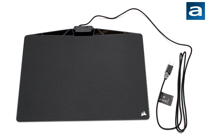 Taking out the Corsair MM800 RGB Polaris, we have a pretty standard design with a big asterisk here. The surface is black, with the exception of the translucent Corsair logo at the bottom right corner. The pad is a gritty surface, which we will inspect soon, while the top part of the pad has a few glossy accents. The top also houses a large plastic block in the middle, where the USB cable protrudes out. At the back of this block is a USB port, which allows you to plug your mouse into the MM800 RGB Polaris through the mousing surface's own plug. The USB cable is necessary to provide power and data for the Corsair MM800 RGB Polaris for its RGB lighting. The cable is braided, quite flexible, and measures approximately 180cm in length.