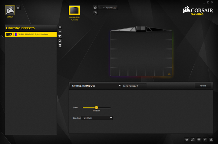 The above picture is where you can go through a list of lighting effects, so I will go through them one by one. The first one is Spiral Rainbow, which spirals a rainbow pattern around the mousepad. Next is Rainbow Wave, and this rotates through the spectrum in a user chosen direction. This is different from the first pattern, as it only shows one color at a time. Visor mode flashes a traveling light around the mousepad. Color Shift transitions all the lights between colors. Color Pulse is like a breathing mode for all of the lighting zones, and Color Wave is similar to Visor, except it travels in one direction only. For all of these modes, traveling speeds and directions can be changed, where applicable. For the non-rainbow modes, the colors can either randomly cycle or alternate between two chosen colors. The last custom mode is Static Color, which allows you to pick the zones and select a single color for it. This mousepad is also Link enabled, which means synchronize all of these effects with your other Corsair products, including their keyboards or mice. This last effect is actually pretty neat, as it provides a more uniform lighting experience, assuming you have other Corsair peripherals. Finally, if all of these colors are not enough, they can also be stacked on top of each other to make for more combinations. I have to say this is one of the better implementations of RGB, even if this is the first time I have seen it on a mousing surface. Lighting is evenly distributed, despite having fifteen distinct zones. With all this aside, the more important part of this review is our performance tests, so let us head on over!