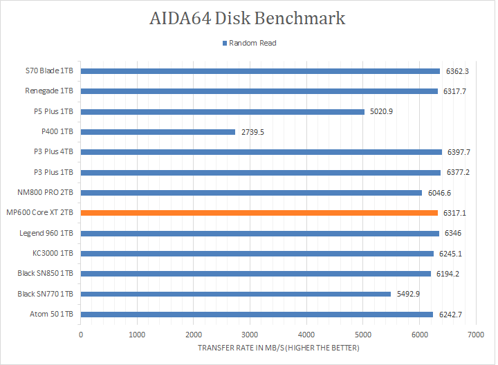 First up on the list are results from one of our favorite benchmarking programs, AIDA64 Engineer. Just to note, AIDA64 Engineer is a full synthetic benchmark. While it is not a representation of real-life performance -- such as how fast Photoshop opens -- it does provide valuable insight into performance between different drives and different controllers. Here, we can see the Corsair MP600 Core XT 2TB was able to keep up with many of the other drives in all categories. It did impressively well in buffered read and with average access time, although it did dip off slightly in the end of the linear read section. While this is just a synthetic test, the MP600 Core XT 2TB is off to a good start.