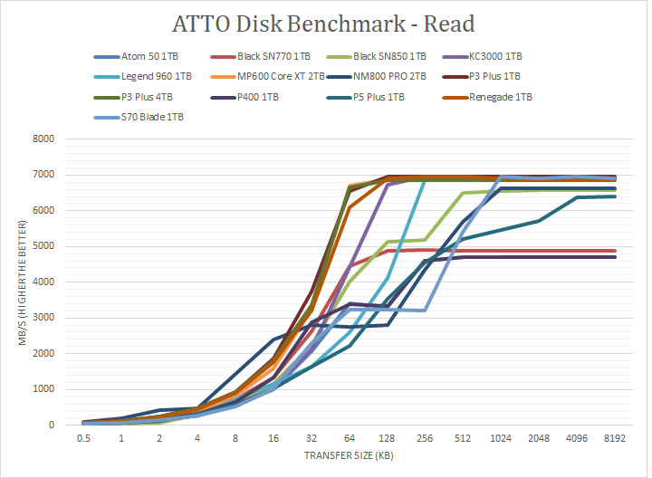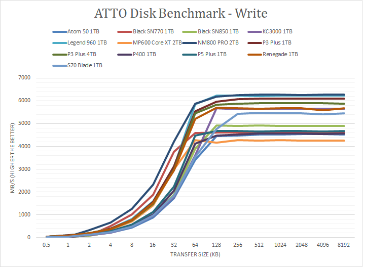 Following up next are our usual ATTO read and write tests. ATTO is an often-quoted benchmark because it is easy to use and accurate. ATTO uses easily compressible data, so compression-heavy controllers will perform very well here. As manufacturer peak read and write performance ratings are usually achievable using ATTO, whether a drive lives up to its marketing claims or not can be validated by this program. Corsair claims the MP600 Core XT 2TB to have a maximum read speed of 5000 MB/s and a maximum write speed of 4400 MB/s. The MP600 Core XT 2TB did not quite reach these figures for the write speed, but came somewhat close with a tested maximum write speed of 4260 MB/s. On the other hand, the MP600 Core XT 2TB surpassed its rated read speed of 5000 MB/s by measuring a maximum read speed of 6900 MB/s. Taking a closer look below the curve, it was almost identical to the Crucial P3 Plus series. The ramp-up write speed was quite fast at moderate file sizes, specifically from 4KB to 32KB. The ramp-up read speed was good between 2KB to 64KB, and ended up being one of the faster drives among all the PCIe 4.0-based drives shown when it came to maximum read speed.