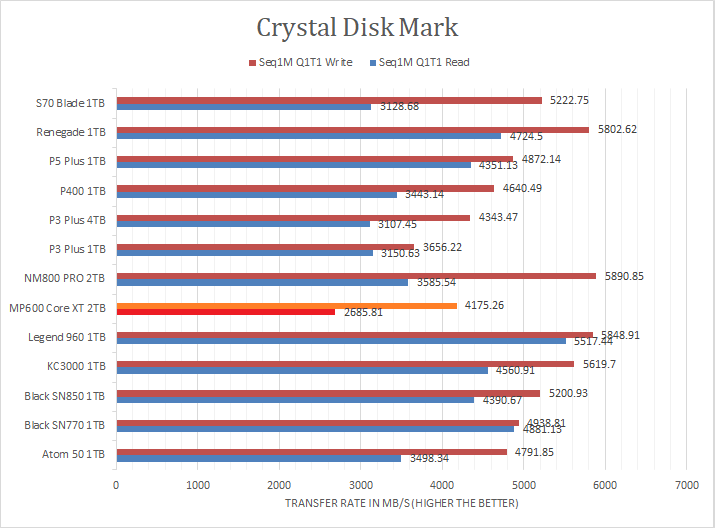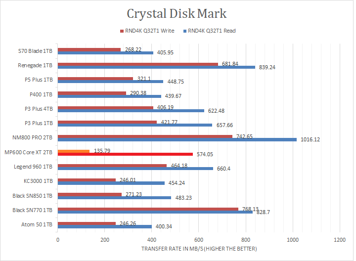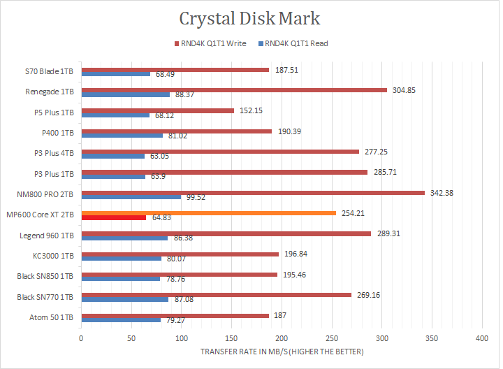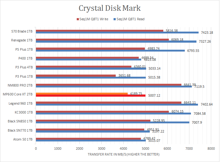 Crystal Disk Mark 8.0 is in the spotlight. Just a bit of background information, higher-capacity drives tend to perform a little better in these tests. The ability of a controller and flash memory to deliver high IOPS will provide huge benefits to the score as well. Taking a look at the results, the MP600 Core XT 2TB had lower results when it came to sequential read and write speeds, which is consistent with other budget PCIe 4.0-based budget drives. The Q8T1 read results specifically were consistent with the likes of the budget Crucial P3 Plus series. The random read and write performance were better, with the MP600 Core XT 2TB dropping in the bottom of the pack with the random 4K Q1T1 results. The random 4K Q1T1 read results were about on par with the P3 Plus 4TB and P3 Plus 1TB, while the random 4K Q1T1 write results landed the MP600 Core XT 2TB in the middle of the pack. The random 4K Q32T1 read also saw the drive scoring around the middle of the pack, although the random 4K Q32T1 results saw the drive falling behind by a wide margin. It is important to note that the MP600 Core XT 2TB was mostly on par with both the Crucial P3 Plus, both its 1TB and 4TB version.