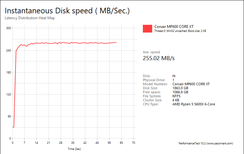 The Corsair MP600 Core XT 2TB showed a little more promise here. The results were 255.02MB/s, 1808MB/s, 1840MB/s, and 255.77MB/s respectively. These numbers fell behind the WD_BLACK SN770 1TB in every category, with the SN770 1TB -- another budget DRAM-less SSD -- posting results at 366.45MB/s, 2716MB/s, 2915MB/s, 300.29MB/s, in the same order. The MP600 Core XT 2TB scored closer to the Crucial P3 Plus 4TB, which scored at 267.87MB/s, 1946MB/s, 2018MB/s, and 257.77MB/s, respectively. The DRAM-less XPG Atom 50 1TB posted results of 32.46MB/s, 519.21MB/s, 2095MB/s, and 210.09MB/s, which the Corsair MP600 Core XT 2TB beat out in each category. The MP600 Core XT 2TB also beat out the Patriot P400 1TB, another budget drive that scored at 34.04MB/s, 543.30MB/s, 1493MB/s, and 198.25MB/s respectively.