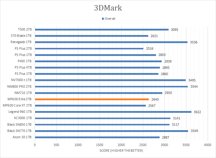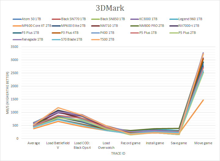 3DMark is the continuously updated version of the popular gaming benchmark from UL. We used 3DMark's Storage Benchmark to test the performance of the Corsair MP600 Elite 2TB. According to UL, the Storage Benchmark uses traces recorded from popular games and gaming-related activities to measure real-world gaming performance. The following traces were used and defined as follows: