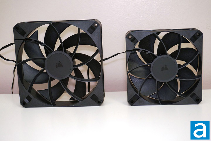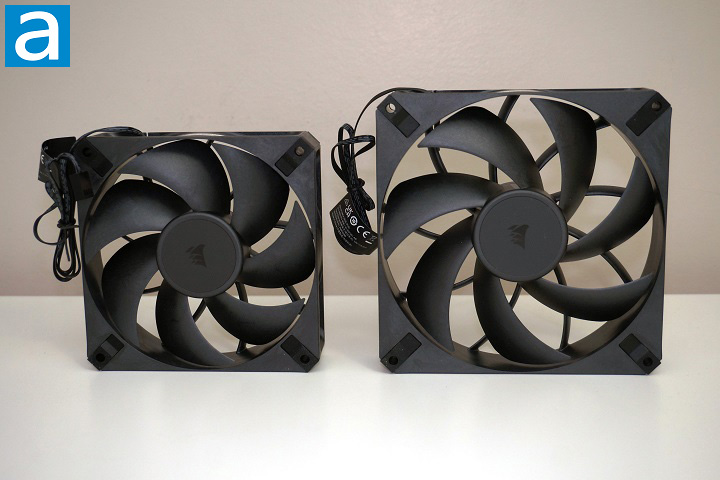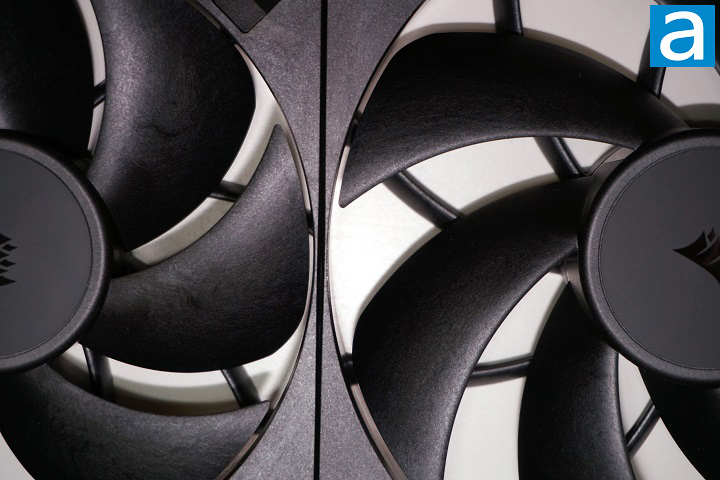 Turning the fans over provides a detailed look at their backside. According to information from Corsair's official website, the RS MAX series fans feature AirGuide technology designed for concentrated cooling. Unusually, there are nine support arms connecting the central hub, which might seem excessive compared to the typical four arms used to minimize airflow obstruction. However, this design is not problematic for two reasons. First, the arms are quite thin. Second, their angled positions actually help guide incoming air. For insights on sound, airflow, and static pressure, I have referenced my colleague Jonathan Kwan's review of the Noctua NF-F12 PWM and NF-P12 PWM fans.