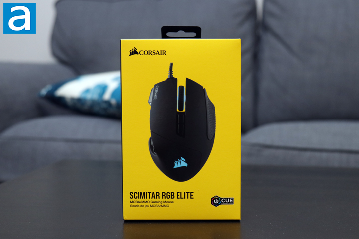 Corsair loves their black and yellow color scheme and this is what we have with the retail packaging of the Corsair Scimitar RGB Elite. Its yellow panel at the front is quite striking and I personally like how bright it stands out from the competition. Otherwise, the mouse is displayed on the front in a scaled down fashion. The Corsair with its sail logo can be found on the top while the bottom shows the name and a description of "MOBA/MMO Gaming Mouse". We also have an "iCUE" logo to show this mouse works with Corsair's software for lighting and other controls. We will look into this later. Around the box we have some information and features regarding the mouse. Just for your information, this is not the first Scimitar mouse released by Corsair, as they have previous versions. From the specifications, it looks like the main difference the Elite and its predecessor is a new sensor.