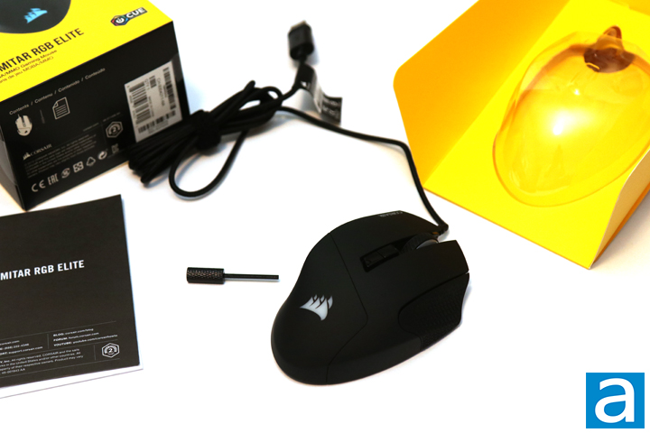 Out of the box, we have the Corsair Scimitar RGB Elite found in a large yellow cardboard and plastic shell with its cable wrapped up securely with a Velcro tie. A small hex key comes with the mouse for some adjustments as we will see on the next page. Otherwise, we have some documentation regarding the mouse and its included warranty. As you may have already read from the specifications chart, this comes with a standard two-year warranty, which is pretty typical for peripherals nowadays.