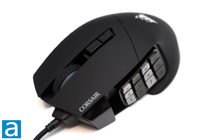 From this angle, you can see all of the buttons on the Corsair Scimitar RGB Elite, which exist mostly on the left side. The first set of keys are the primary Omron switches with a fifty million actuation lifespan. Overall, these switches feel light and easy to press while offering good feedback. In the middle we have a scroll wheel with translucent edges. It offers a notched feel, which is pretty typical for most mice. Otherwise, underneath the scroll wheel are two buttons for quick profile and DPI switching. These secondary keys are alright with good feedback, but not as deep of a button travel. However, the real star of the show is the 3x4 grid of side buttons. This number pad array of keys is stacked in this way to be accessible to your thumb, while the whole grid can be slid back or forth to adjust to each user. Each subsequent column of buttons has a different texture so users can differentiate which column of keys they are pressing in. The button marked "5" also has a small ridge to also help you know where your thumb is. The buttons offer a bit of wiggle movement, which should reduce accidental presses. As for their actions, you will need to use Corsair's iCUE software to adjust the functions of these buttons, as they have no default behavior.