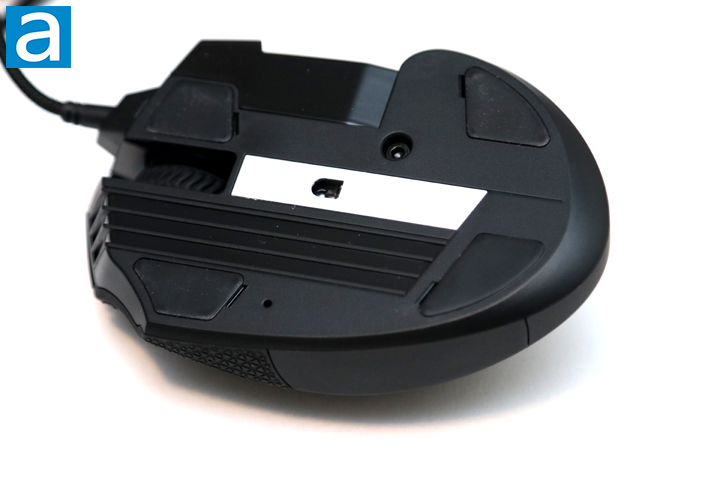 At the bottom of the mouse are a few more things of interest to point out. First of all, we have four PTFE or polytetrafluoroethylene pads, which is commonly known as Teflon, in various shapes and sizes. The skates themselves are pretty smooth and protrude just enough so that none of the other grooves catch at the bottom of the mouse. On the right side, near the side number pad, is a small hex screw to be used with the key provided. When you loosen this screw, the side button grid can be moved as a whole. This works well as it holds it in place when it needs to and is easy to adjust on the fly, even if it does require an additional tool. There are some other stylistic elements here, such as the three deep grooves that come from the front of the mouse. A hole in the silver plate in the middle is where the sensor of the Corsair Scimitar RGB Elite is situated. This is a Pixart PMW3391, which is seemingly a custom PMW3389 with support for higher sensitivity and finer sensitivity adjustment steps. Other mice like the Cooler Master MM711 and MM710 both use the vanilla version of the sensor. The PMW3391 tracks at high speeds of 400 IPS with acceleration up to 50g, though it is not enabled by default. Polling rate is set to a minimum 1ms, or a maximum frequency of 1000Hz, and a maximum native resolution of 18000 DPI.