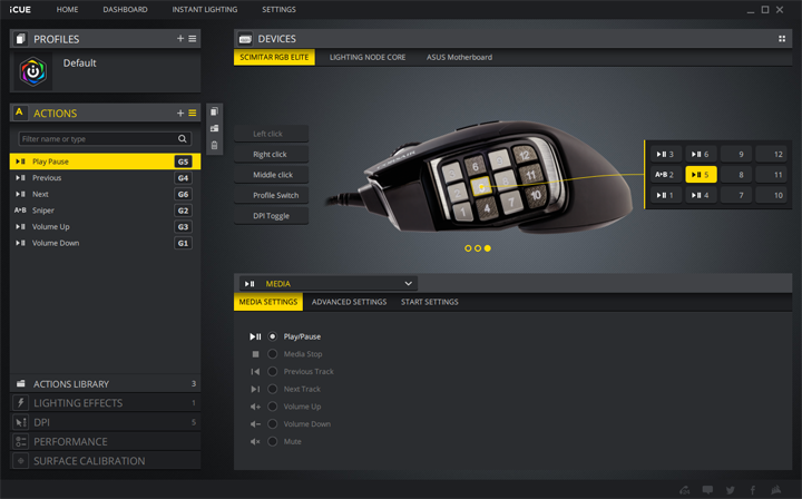 Corsair divides up their software into several tabs on the left side, so I will quickly go through each one. In the Actions section, users can set actions for all of their buttons besides the primary left-click. This includes actions such as user-recordable macros, keyboard and mice actions, media functions, application launching, and more. Assigning these actions is done by creating a single action for each key. I would have much preferred an action page to hold all of the actions for all of the configured buttons. Under Actions Library, you can save your commonly used actions to recall when configuring. The Lighting Effects page lets you change the lighting for the four RGB zones on the mouse. This includes the logo at the back, the keypad on the side, the scroll wheel, and a front illuminated area. There is actually one more RGB area on the side of the mouse, but this is specifically used for the next tab, DPI, where you can set your sensitivity settings and the corresponding light for this area. I think this is great to let users quickly know what sensitivity they are using. Here you can also create and set a new profile of DPI settings altogether. Under Performance, users can change the lift off distance, angle snapping, and pointer speed. Finally, Surface Calibration is exactly as the title reads, letting users adjust the mouse to the surface it will be used on with a tool. Overall, the iCUE software is a polished product that enhances the experience of using Corsair products.