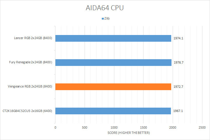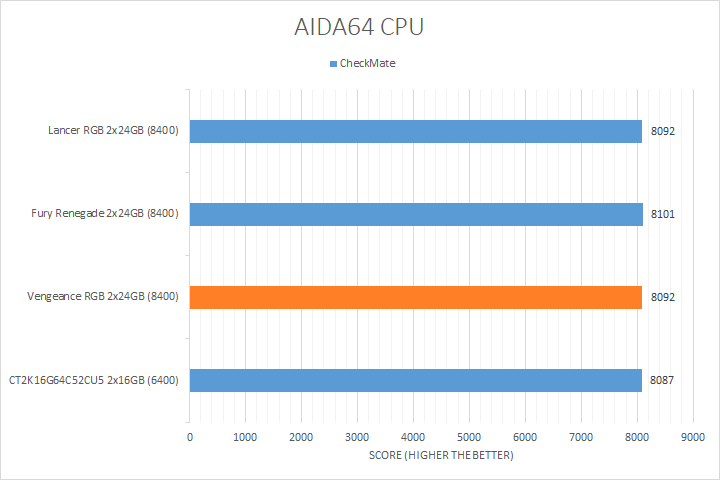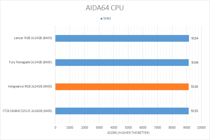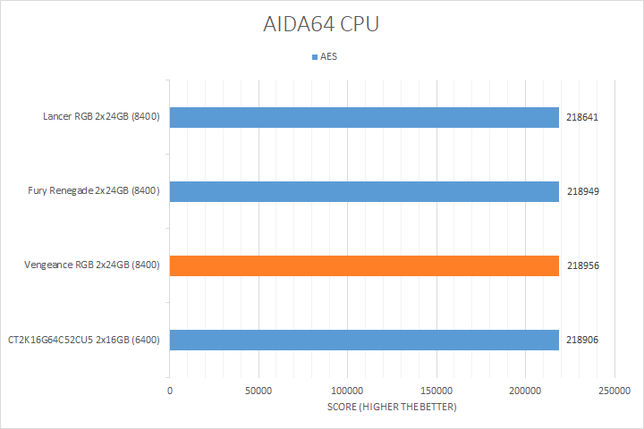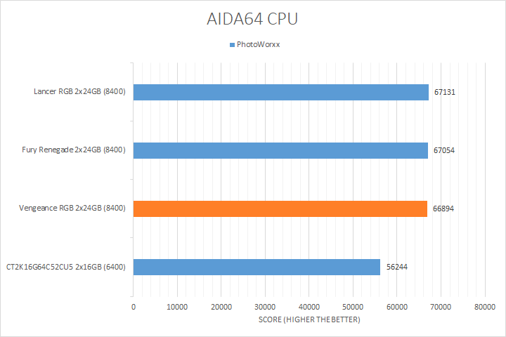 It was quite interesting how the products compared, because there are two gigahertz between the fastest and slowest kit. As far as how their performance went, all of them were close to each other in most tests, with the Corsair Vengeance RGB DDR5-8400 2x24GB sitting at where we expected it to be in relative to the compared kits. AIDA64 did not gain much from stepping up your memory speed with the exception of the PhotoWorxx results, where the DDR5-8400 Corsair Vengeance, Kingston Fury Renegade, and XPG Lancer CUDIMM RGB kits occupied the upper end of the chart, while the DDR5-6400 Crucial CT2K16G64C52CU5 stayed at the back.