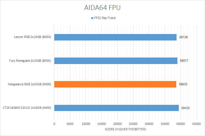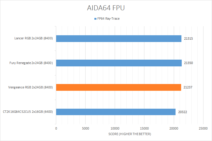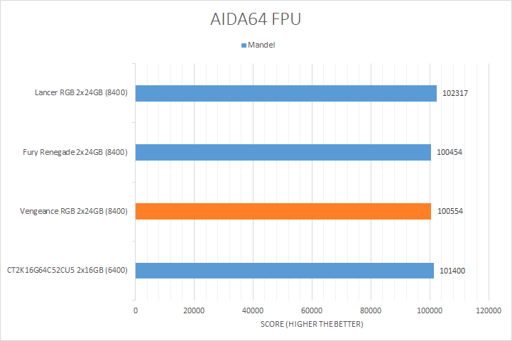As you can see from our graphs above, all the results were within a few percent of each other. There were three results where the difference was more noticeable, particularly the Mandel, FP32 Ray Trace, and FP64 Ray Trace tests. However, there was little correlation with the memory bandwidth, as the DDR5-6400 Crucial led in the FP32 Ray Trace results, but fell behind the DDR5-8400 Corsair Vengeance, Kingston Fury Renegade, and XPG Lancer CUDIMM RGB kits in the FP64 Ray Trace benchmark. At the end of the day, they were almost all reasonably within the same ballpark as each other.