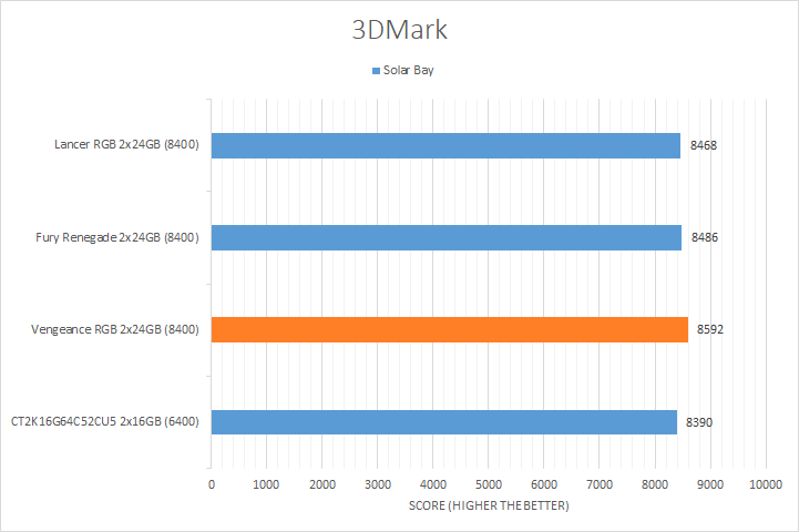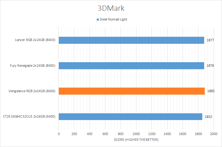 As you can see in our graphs above, the Corsair Vengeance RGB DDR5-8400 2x24GB, Kingston Fury Renegade DDR5-8400 2x24GB, XPG Lancer CUDIMM RGB DDR5-8400 2x24GB, and Crucial CT2K16G64C52CU5 DDR5-6400 2x16GB remained close to each other, showing memory bandwidth played a relatively minor role in these tests.