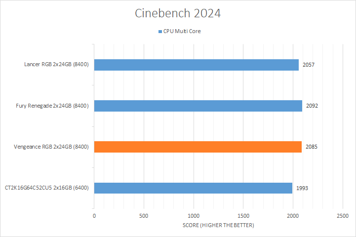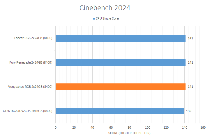 As you can see in our charts above, there was a small but measurable difference between different RAM models in the CPU Multi Core test, even among DDR5-8400 kits. The CT2K16G64C52CU5 did come in last due to its memory bandwidth limitation, which was expected. In the CPU Single Core test, all DDR5-8400 kits, including the Corsair Vengeance RGB, tied for first, but the difference was basically negligible with a two point advantage over the DDR5-6400 Crucial.