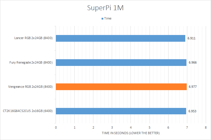 We have always included SuperPi in our benchmark results, because it is a quick and dirty run that always proves to be interesting. It is neither the fastest way to calculate Pi nor is it the most challenging. But being an enthusiast at heart, this program has always provided interesting results for showing off your overclocking prowess on your favorite online outlet. All the results regardless of model and bandwidth were within a hair of each other.
