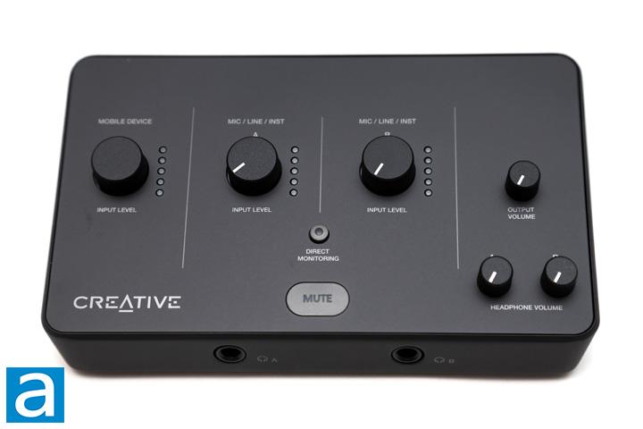 As for the top-facing adjustments, they are laid out logically into their own sections. From the left side, we have the first section marked Mobile Device, which is where you can make adjustments for the 3.5mm audio jack at the back. This knob controls the input level, as indicated by its label. Unlike all of the other knobs, this knob spins freely. When you make adjustments, the five blue LEDs near the knob illuminate to show the current level. The next two sections are for the two combination inputs, marked A and B. Both of these knobs adjust their respective input with a set of five indicator LEDs for each. These lights provide user feedback for the current levels. The bottom three lights are green, while the fourth light is yellow, and the top light is red. This provides users with a quick cue if their inputs are peaking or maxing out the volume. Underneath the two knobs, we have a button to cycle between direct monitoring modes. Creative provides two modes, which are mono and stereo monitoring. Mono monitoring will let you hear both inputs on both sides, while stereo monitoring will split the inputs into left and right channel with one side for each ear. The circular button will glow green for mono and blink green for stereo. Underneath, we have a nice rubbery button marked mute, which disables the inputs. The button will also glow red when mute is enabled.