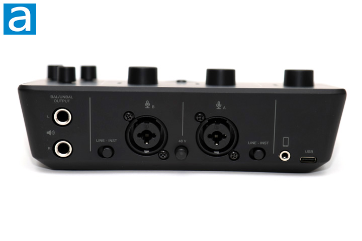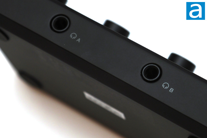 The final section of the top-facing adjustments is for the output, which are linked to the outputs at the front and back. The top smaller knob controls the balanced output at the back, while the two knobs underneath control the headphone output at the front. Both of these headphone outputs are 1/4" plugs. It is pretty neat to see two headphone outputs here, as most audio interfaces only provide one. I also appreciate the placement of these outputs at the front for easy access. On the other hand, one thing to note is although they are marked A and B, these letters do not correlate to the input A and B, as they are outputting the same signal.