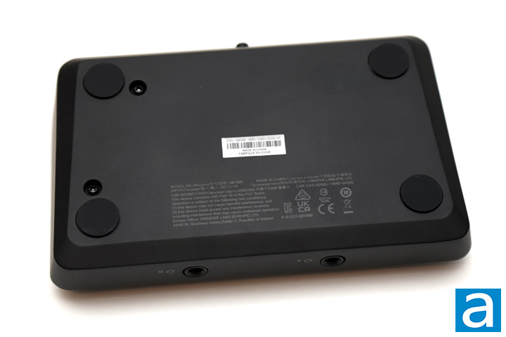 At the bottom, there is not too much to speak of. First, you will see the four circle rubber pads to keep the Creative Live! Audio A3 in place. There are two exposed screws to hold the unit together. In the middle, we have a small label with the serial number on it. Underneath, there is printing regarding the certifications for this unit. As well, you can see this was made in China. On the sides, you can see how the edges are beveled and sloped inwards.