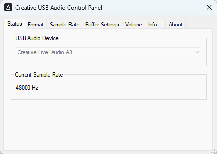 Starting from the first tab, we have Status, which shows the current device and sample rate. The Format tab is where you can choose the input and output channel and bit depth. I would have liked to see the option here to change the output to a single channel output, which is helpful if you only have a single microphone connected or to simplify the output. The Sample Rate menu is used to choose the input and output sample rate, as they are tied to each other. Buffer settings is where you can select the ASIO buffer size and see its current status. The Volume tab is where you can adjust the input and output volume. The Info tab provides information about the hardware connected. Finally, the About tab shows the information about the utility. Overall, the utility is pretty bare bones, but it does the job.