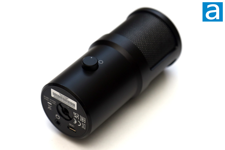 Taking a closer look at the front of the Creative Live! Mic M3, you can see a few things of interest. At the top, there are three holes near the metal grille for magnets to hold the pop filter. The three holes ensure the filter stays in place and does not swivel about. It is pretty nice to see a custom pop filter provided by Creative, especially as it should help with reducing plosive noises while not needing to rely on a third-party solution. Underneath, we have a rectangle diffuser for the indicator light to shine through. When the microphone is powered on, the light shines blue. This changes to red when users mute the Mic M3. Muting the input can be done with the bottom button, which is indicated by the slash through the mic logo. Above this, we have a knob to adjust the output volume to the headphone jack underneath. I think this selection of inputs is handy for quick adjustments on-the-fly.