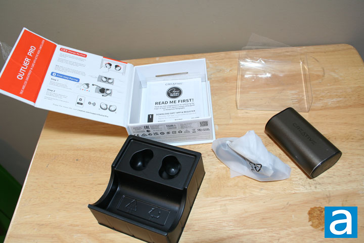 Opening the box reveals the contents, which include the earphones themselves, carrying case, and some documentation including a manual, warranty information, and information on the SXFI mobile application. The earphones and the carrying case are placed snug inside a black plastic shell. Removing the shell reveals a small bag containing other bags inside it. We also get a 27cm USB Type-C to Type-A cable. Finally, we get different earbud sleeves to fit a wide variety of ears. The Creative Outlier Pro comes with a 1-year limited warranty.