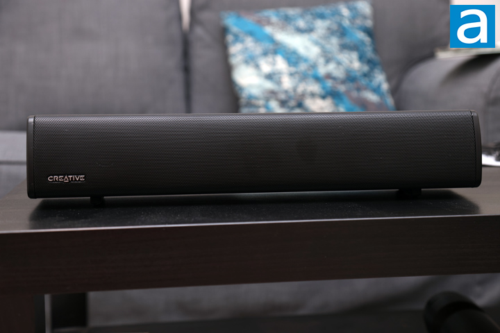 You might think we have already seen a Creative soundbar that looks like this. With its metal grille front and Creative logo on the front, this soundbar looks remarkably similar to the Stage Air V2. Of course, there are subtle differences, including a lower Creative logo. In addition, we do not have any glossy exterior around the unit, meaning it does not attract fingerprints. What is clearly similar is its size, which measures 410mm in length, 92.7mm in depth, and 73.7mm in height. Its wedge shape means the front facing portion is larger compared to the back. In terms of weight, it is 2.2lbs or 1.037kg, which is light. Unlike the Stage Air V2, this is not a portable device, as there is no internal battery. Even so, everything feels solid. The front grille does have a bit of flex if you push hard enough, but it is nothing too concerning. The rest of the body feels light but sturdy.